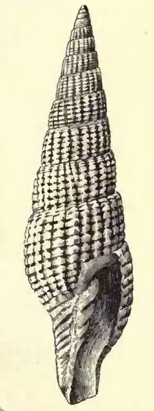 (Original description) The shell is pale yellowish, white, or pinkish, sometimes with a faint peripheral brownish band, or mottled brown and white. The shell is elongated, acute, cancellately sculptured. The protoconch is elongated, pointed, glassy, pale brownish, smooth, consisting of about three and a half whorls. The other whorls number 10-14. They are subconvex, with a distinct but not channelled suture. The axial sculpture shows about (on the body whorl) 25 slightly flexuous regular narrow even transverse ribs separated by wider interspaces, extending clear over the whorl. The spiral sculpture shows (behind the suture about 6-10) even threads, separated by squarely channelled narrower interspaces, crossing the ribs and with a tendency to form a nodule at the intersection. The siphonal canal is rather slender, with seven or eight strong spiral threads externally, which are crossed only by incremental lines. The tip of the siphonal canal is slightly recurved. Internally the outer lip is thin, unreflected, and smooth. Deeper in the aperture are 6-10 fine spiral elevated lirae, ending in the adult in as many little knobs. On the body whorl near the angle with the outer lip, at certain stages, is a single small elevated callus. Over the surface and on the column the callosity is thin. The columella has three well-defined plaits behind its own margin, the posterior the largest. The completely adult may have two more. L
