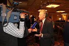 Shortly after joining, Goode moved up in the Constitution Party ranks. Party founder and Virginia chairman Howard Phillips named him to the National Committee in 2010, and in November of that year, National Committee Chairman Jim Clymer appointed him to the party's executive committee.[13] The moves encouraged rumors that he was considering a 2012 presidential run. Such speculation continued in 2011,[15][16][17] as Goode increased his visibility in paleoconservative circles. He participated in a Conservative Political Action Conference (CPAC) panel arguing against both illegal and legal immigration,[18] and wrote an article for The American Conservative opposing the passage of the South Korea–United States Free Trade Agreement.[19] In April 2011, after Goode delivered a speech at a Constitution Party meeting, the Constitution Party National Committee unanimously passed a resolution asking him to seek their presidential nomination.[20] In a press release, the party said that he had "expressed a strong interest" in the nomination.[21] Thereafter, Goode told The Roanoke Times that he would "consider it as the year progresses".[22] Clymer informed the publication that "There's nothing that I can see now that would prevent him from getting the nomination were he to say he indeed wants it."[22]