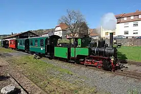 The Wächtersbach–Bad Orb railway was originally a standard gauge line, which began in Wächtersbach and ran to Bad Orb. It was opened on 23 May 1901[4] and closed on 4 March 1995. On 26 May 2001, the first section in Bad Orb was reopened as a 600-mm gauge railway and the whole route to Wächtersbach has been operated since 29 October 2006 (locomotive Emma). The seasonal service operates on Sundays and public holidays from Easter to the end of October. Trains stop at the former station called Wächtersbach Kleinbahnhof next to Wächtersbach station and the operator uses the (unofficial) platform 21.