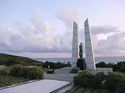 The "Gate of Ice and Snow" (氷雪の門, Hyōsetsu no mon) is a memorial to those who died in Karafuto. At its centre is a statue of a woman with a look of pain and anguish, her face to the heavens and hands to the earth, her back to Sakhalin. An inscription explains that the monument expresses "grief at the loss of everything held dear".[3] The memorial was built by Sapporo sculptor Hongō Shin (本郷新) in 1963 and has the more formal name of Karafuto Islanders Memorial (樺太島民慰霊碑).[2] This memorial is flanked to the left, when facing the sea, by a monument to the "Nine Maidens of Maoka" (九人の乙女の像), nine telephone operators at the post office in Maoka, now Kholmsk, who committed suicide on 20 August 1945 during the Soviet Invasion of South Sakhalin, and, to the right, by a monument inscribed with a poem by the Shōwa Emperor, composed when he heard the story during his visit with Empress Kōjun in 1968.[2][3]