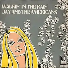 The pop group Jay and the Americans released a cover of "Walkin' in the Rain" in 1969 on their album Wax Museum, Vol. 1. Their version of the song reached number 19 on the U.S. Billboard Hot 100 and peaked at number 14 on Cash Box. It also hit number 8 on the Adult Contemporary chart, it was the last top-40 hit for the group.[8]