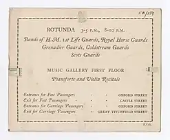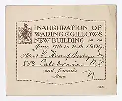 A new Waring & Gillow building was opened in 1906 on Oxford Street and signalled a true integration of both companies.[9] The inauguration event took place from 11 to 16 June 1906. The Brotherton Library Special Collections archive at Leeds University houses the John Evan Bedford Library of Furniture History. This collection, collected by antiques dealer John Bedford, contains a ticket from the inaugural Waring & Gillow event (below right). The ticket shows that there had been music and entertainment during the evening as well as demonstrating the general grandeur of the affair, with separate entrances for guests using carriages.[13]