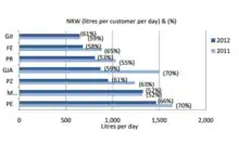 Leakages or water technical losses are one of the main concerns for the water supply network in Pristina. The percentage of water not being distributed to the end consumer, but instead being lost through the distribution network is high, mainly due to the old infrastructure and the lack of investments. However, the exact amount of water which is leaked throughout the distribution system cannot be measured; instead, it can be approximated through non-revenue water. The downside of using this measurement method to approximate the technical losses of water stands in the fact that the non-revenue water, apart from leakages that happen throughout the system, also takes into account the illegal connections on the system which represent commercial losses. The amount of non-revenue water in Pristina has slightly decreased from 2011 to 2012. Nonetheless, it still remains high. This difference between the water produced and the amount of water billed in Pristina on 2011 was slightly more than 25 million m³, whereas on 2012 it decreased to around 24 million m³.[2]