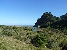 Most Māori settlements in West Auckland centred around the west coast beaches and the Waitākere River valley, especially at Te Henga / Bethells Beach.[58][59] Instead of living in permanent settlements, Te Kawerau ā Maki and other earlier Tāmaki Māori groups seasonally migrated across the region.[60] The west coast was well known for its abundant seafood and productive soil, where crops such as kūmara, taro, hue (calabash/bottle gourd) and aruhe could be grown, and for the diversity of birds, eels, crayfish and berries found in the ranges.[61] Archaeological investigations of middens show evidence of regional trade between different early Māori peoples, including pipi, cockles and mud-snail shells not native to the area.[59] Unlike most defensive pā found on the Auckland isthmus, not many Waitākere pā used defensive ditchwork, instead preferring natural barriers.[62]