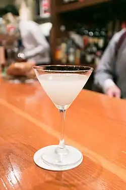 White lady (also known as a Delilah,[1] or Chelsea sidecar[1]) is a classic cocktail that is made with gin, cointreau or Triple Sec, fresh lemon juice and an optional egg white.[2] It belongs to the sidecar family, made with gin in place of brandy. The cocktail sometimes also includes additional ingredients, for example egg white, sugar, cream, or creme de menthe.[3]