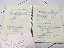Student's notebook pages from a 1973 calculus class at Cornell showing Waterhouse illustrating the applicability of Fourier series to music theory by singing notes and commenting on their harmonics