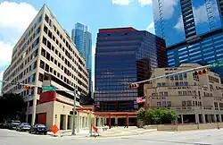 The complex, originally named Republic Plaza, was developed by Austin developers Watson-Casey Companies, originally envisioned as the first phase of a 60-acre urban renewal project for Austin's Warehouse District.[1] The unbuilt redevelopment's master plan, designed by urban planner Denise Scott Brown, would have included a new city hall for the city of Austin and a new location for the Laguna Gloria art museum, designed by architect Robert Venturi.[3]