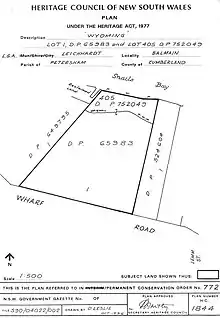 Text is licensed by State of New South Wales (Department of Planning and Environment) under CC-BY 4.0 licence. - ↑ "Wyoming, 25 Wharf Rd, Birchgrove, NSW, Australia". Register of the National Estate. Department of the Environment and Energy. Retrieved 30 September 2018.