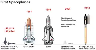 The X-37 (far right) is the smallest and lightest orbital spaceplane yet flown. Both the North American X-15 and SpaceShipOne were suborbital. Of the spaceplanes shown, only the X-37 and Buran conducted uncrewed spaceflights.
