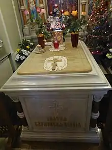 Xenia's grave is in the Smolensky Cemetery of St. Petersburg. It has been marked by an ornate chapel since 1902. She was canonized by the Russian Orthodox Church Outside Russia on September 24, 1978 (O. S. September 11, 1978) in the Synodal Cathedral of Our Lady of the Sign in New York, USA and by the Russian Orthodox Church on June 6, 1988 during the Local Council of the Russian Orthodox Church. Her feast day in the Old Style Calendar is January 24, which is February 6 in the New Calendar. In July 2020, the Holy Synod of the Romanian Orthodox Church also resolved to include Xenia of St. Petersburg in its calendar on January 24.[1]
