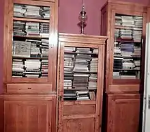 Charents's personal library forms a part of the Memorial House. According to the poet's daughter Arpenik, his library consisted of 6000 books in the 1930s. After his arrest during Joseph Stalin's Great Purge, a large number of books were destroyed. Now there are 1452 books in the library, including many valuable works in different languages on different subjects, such as arts and religion.[2]