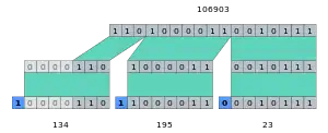 A variable-length quantity (VLQ) is a universal code that uses an arbitrary number of binary octets (eight-bit bytes) to represent an arbitrarily large integer. A VLQ is essentially a base-128 representation of an unsigned integer with the addition of the eighth bit to mark continuation of bytes. VLQ is identical to LEB128 except in endianness. See the example below.